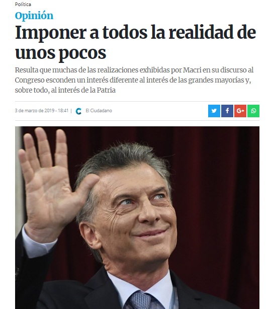 Resulta que muchas de las realizaciones exhibidas por Macri en su discurso al Congreso esconden un interés diferente al interés de las grandes mayorías y, sobre todo, al interés de la Patria. Por ejemplo, el desarrollo de sectores clave como el energético o extractivo es presentado al conjunto de la ciudadanía como un logro a celebrar, pero en realidad son las empresas concesionarias y beneficiarias las que se llevan las ganancias, mientras que en las calles de todo el país se desarrollan permanentes manifestaciones en contra de la política tarifaria que transforma en prohibitivo el consumo de los servicios básicos.